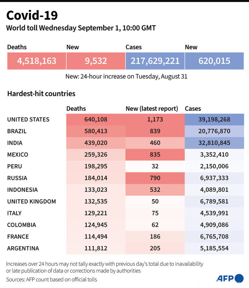 【9月1日 AFP】AFPが各国当局の発表に基づき日本時間1日午後7時にまとめた統計によると、世界の新型コロナウイルスによる死者数は451万8163人に増加した。