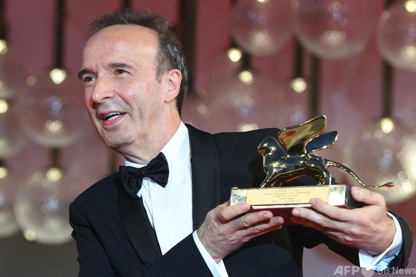 オープニングイベントでは、1998年の映画『ライフ・イズ・ビューティフル(Life is Beautiful)』でアカデミー賞を受賞したイタリアの俳優で監督のロベルト・ベニーニ(Roberto Benigni)に栄誉金獅子賞が贈られた。(c)AFP/Alexandria Sage and Eric Randolph