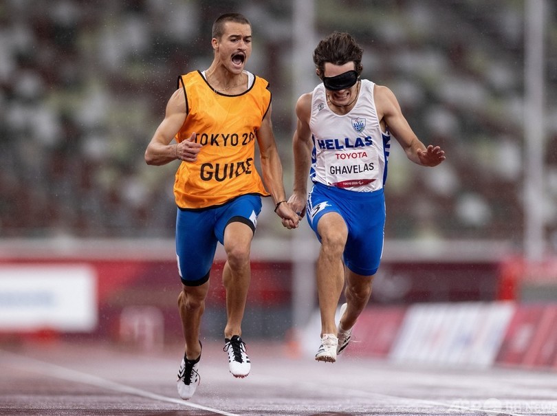 【9月5日 AFP】東京パラリンピック、陸上男子100メートル(視覚障害T11)予選で世界新記録を出し、抱き合うギリシャのアサナシオス・ガベラス(Athanasios Ghavelas)とガイドのソティリオス・ガラガニス(Sotirios Gkaragkanis)。オリンピック・スタジアム(Olympic Stadium)で。(c)AFP