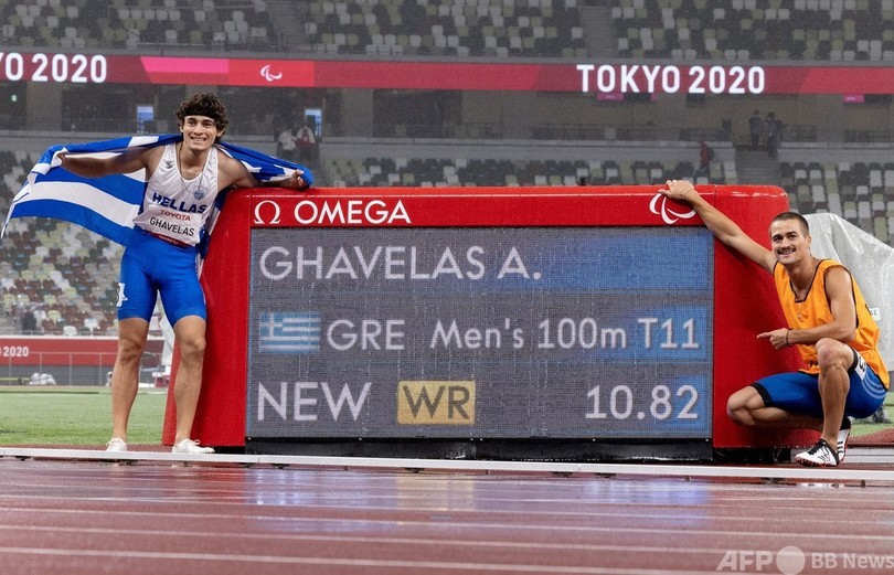 【9月5日 AFP】東京パラリンピック、陸上男子100メートル(視覚障害T11)予選で世界新記録を出し、抱き合うギリシャのアサナシオス・ガベラス(Athanasios Ghavelas)とガイドのソティリオス・ガラガニス(Sotirios Gkaragkanis)。オリンピック・スタジアム(Olympic Stadium)で。(c)AFP