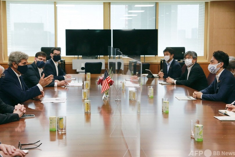 ケリー氏は今週、中国訪問に先立ち、日本を訪問。今回の外遊は、11月に開催される気候変動枠組み条約第26回締約国会議(COP26)を前に、緊急を要する気候変動問題への取り組みに対する支持を取り付ける狙いがある。(c)AFP
