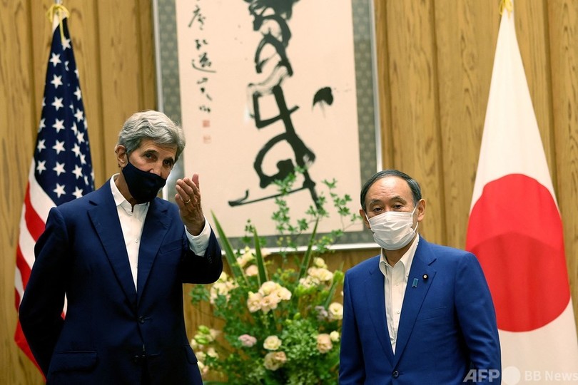 ケリー氏は今週、中国訪問に先立ち、日本を訪問。今回の外遊は、11月に開催される気候変動枠組み条約第26回締約国会議(COP26)を前に、緊急を要する気候変動問題への取り組みに対する支持を取り付ける狙いがある。(c)AFP