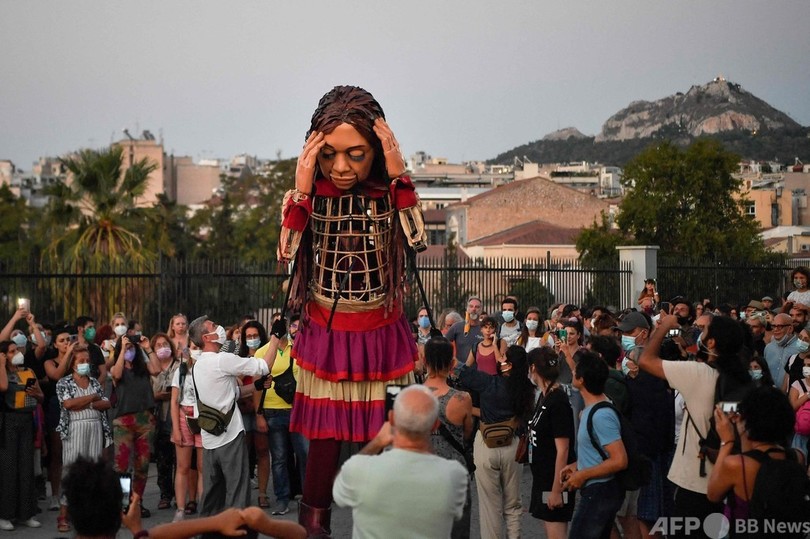 【9月3日 AFP】ギリシャのアテネで2日、シリア難民の少女を模した大きな操り人形「Little Amal(小さなアマル)」が市内を練り歩いた。