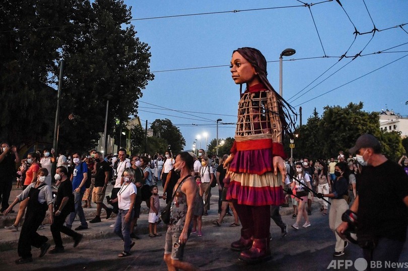 【9月3日 AFP】ギリシャのアテネで2日、シリア難民の少女を模した大きな操り人形「Little Amal(小さなアマル)」が市内を練り歩いた。