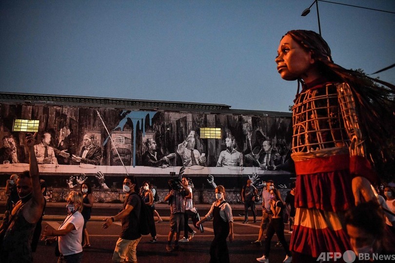 【9月3日 AFP】ギリシャのアテネで2日、シリア難民の少女を模した大きな操り人形「Little Amal(小さなアマル)」が市内を練り歩いた。