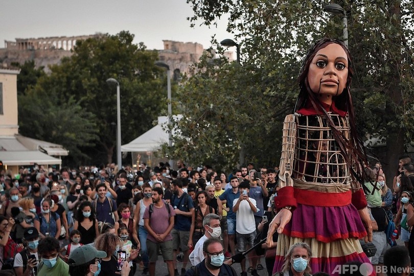 【9月3日 AFP】ギリシャのアテネで2日、シリア難民の少女を模した大きな操り人形「Little Amal(小さなアマル)」が市内を練り歩いた。