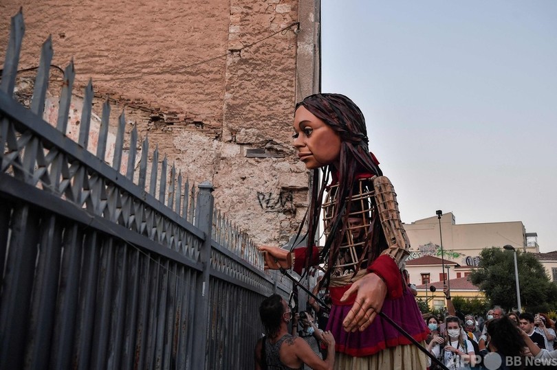 【9月3日 AFP】ギリシャのアテネで2日、シリア難民の少女を模した大きな操り人形「Little Amal(小さなアマル)」が市内を練り歩いた。