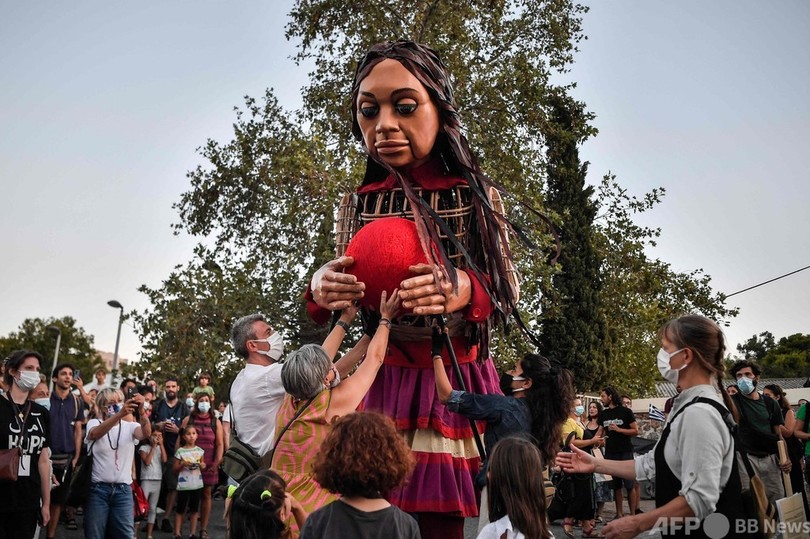 【9月3日 AFP】ギリシャのアテネで2日、シリア難民の少女を模した大きな操り人形「Little Amal(小さなアマル)」が市内を練り歩いた。
