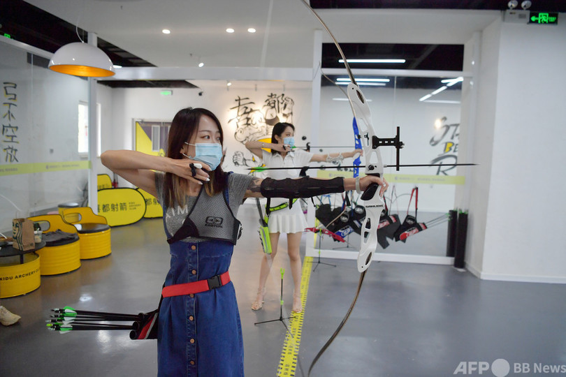 長春市内のアーチェリー館では夏休み期間中、カップルや若い女性らが多く訪れた。アームガード(小手当て)やチェストガード(胸部プロテクター)、クィーバー(矢入れ)などを装着した本格的な出で立ちで、的をめがけて弓を放った。