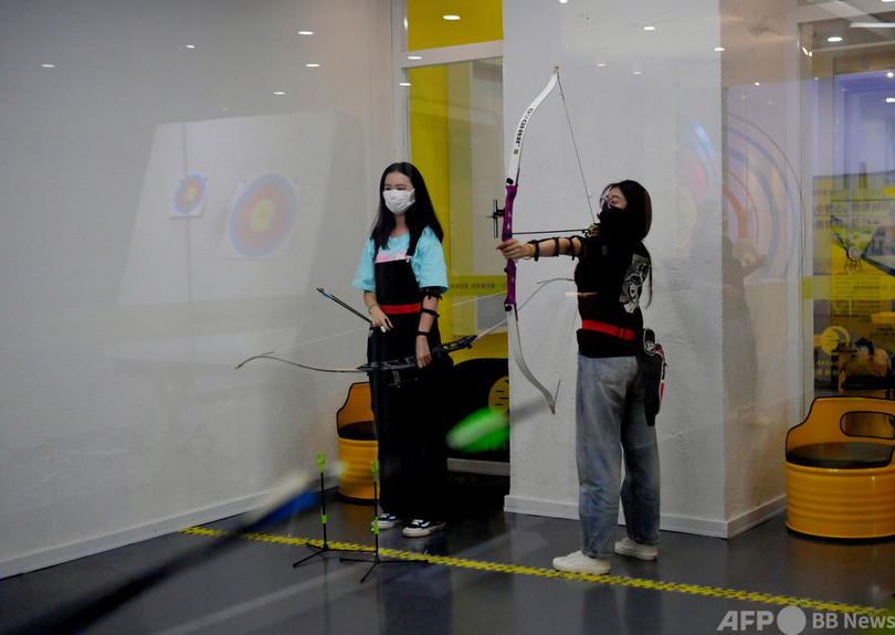 長春市内のアーチェリー館では夏休み期間中、カップルや若い女性らが多く訪れた。アームガード(小手当て)やチェストガード(胸部プロテクター)、クィーバー(矢入れ)などを装着した本格的な出で立ちで、的をめがけて弓を放った。