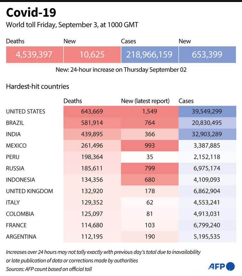 【9月4日 AFP】AFPが各国当局の発表に基づき日本時間3日午後7時にまとめた統計によると、世界の新型コロナウイルスによる死者数は453万9397人に増加した。