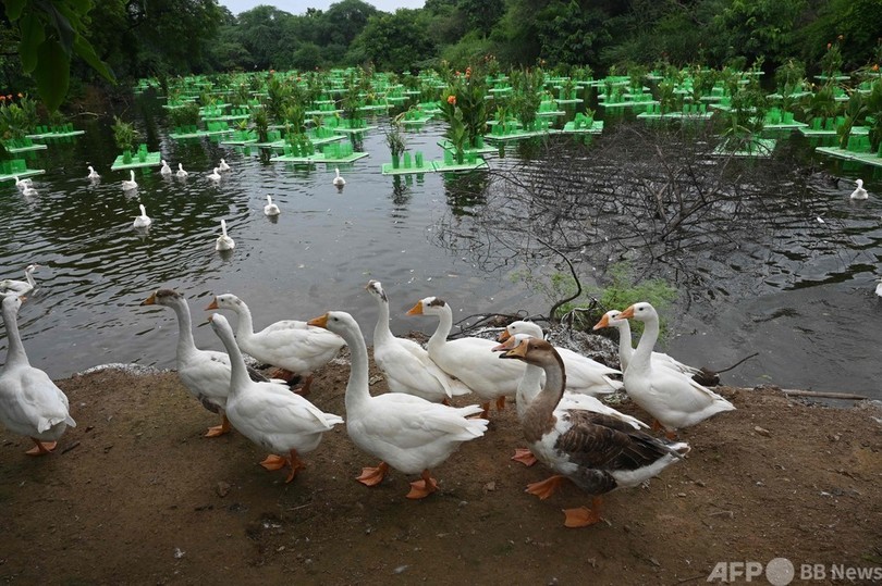 【9月6日 AFP】インド・ニューデリーにあるサンジェイ・バン・レーク(Sanjay Van Lake)をきれいにするため、デリー(Delhi)当局は水質浄化能力のあるシュロガヤツリなどを植えた多数のいかだを浮かべている。(c)AFP