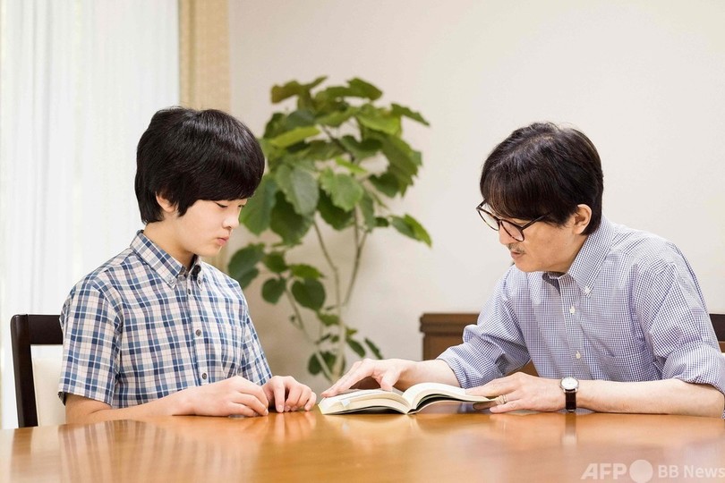 宮内庁が公開した写真には、悠仁さまが本を開いて秋篠宮さまとやりとりされる様子も見られた。(c)AFP