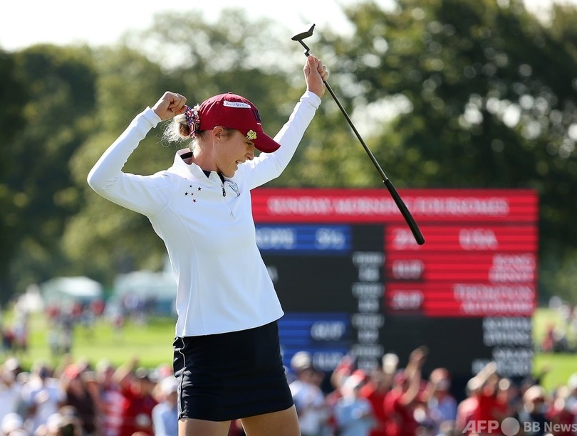 米国選抜はジェニファー・カプチョ(Jennifer Kupcho)/リセット・サラス(Lizette Salas)組がメリッサ・レイド(Melissa Reid、イングランド)/レオナ・マグワイア(Leona Maguire、アイルランド)組に1アップでリードしていたが、最終ホールにレイドがバーディーパットを沈めて引き分けに持ち込み、欧州選抜に貴重な0.5ポイントを加えた。(c)AFP