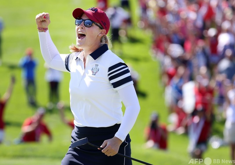 米国選抜はジェニファー・カプチョ(Jennifer Kupcho)/リセット・サラス(Lizette Salas)組がメリッサ・レイド(Melissa Reid、イングランド)/レオナ・マグワイア(Leona Maguire、アイルランド)組に1アップでリードしていたが、最終ホールにレイドがバーディーパットを沈めて引き分けに持ち込み、欧州選抜に貴重な0.5ポイントを加えた。(c)AFP