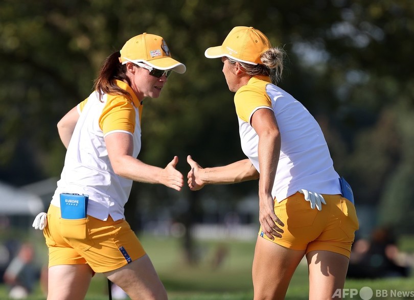 米国選抜はジェニファー・カプチョ(Jennifer Kupcho)/リセット・サラス(Lizette Salas)組がメリッサ・レイド(Melissa Reid、イングランド)/レオナ・マグワイア(Leona Maguire、アイルランド)組に1アップでリードしていたが、最終ホールにレイドがバーディーパットを沈めて引き分けに持ち込み、欧州選抜に貴重な0.5ポイントを加えた。(c)AFP