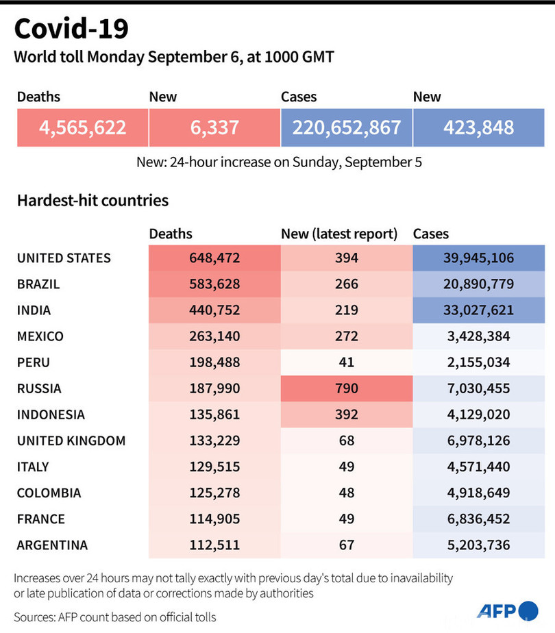 【9月7日 AFP】AFPが各国当局の発表に基づき日本時間6日午後7時にまとめた統計によると、世界の新型コロナウイルスによる死者数は456万5622人に増加した。