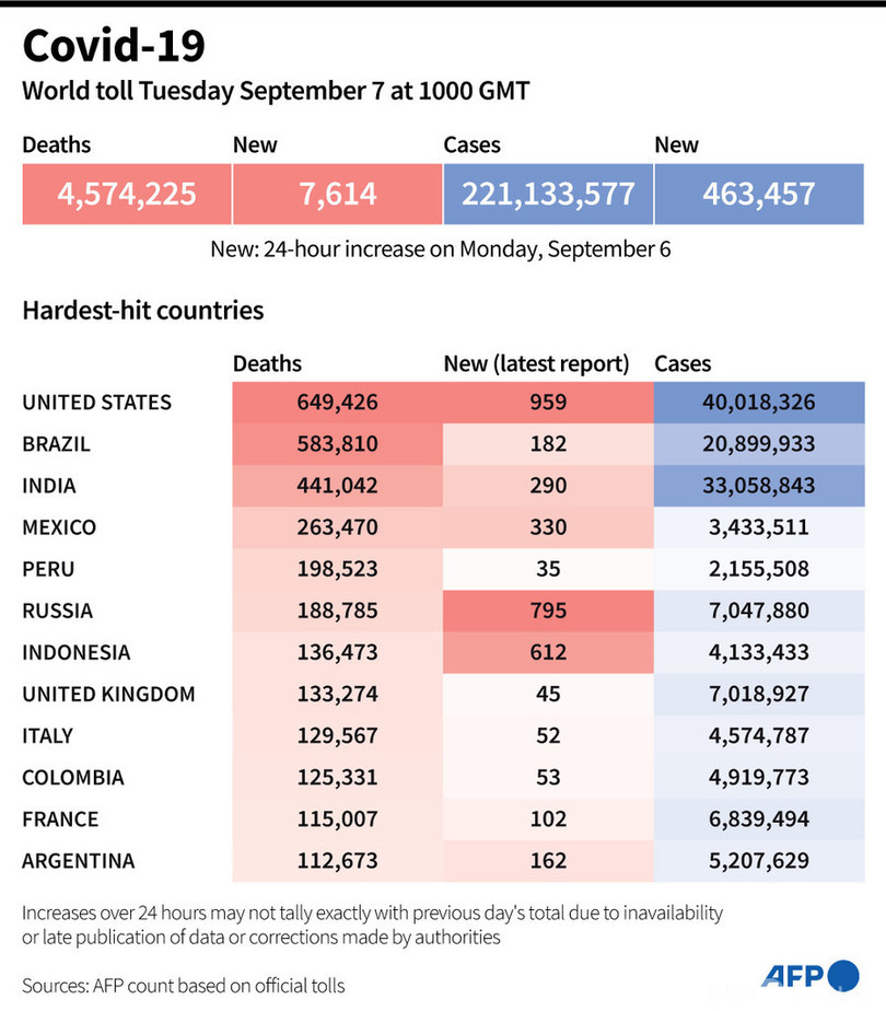 【9月7日 AFP】AFPが各国当局の発表に基づき日本時間7日午後7時にまとめた統計によると、世界の新型コロナウイルスによる死者数は457万4225人に増加した。