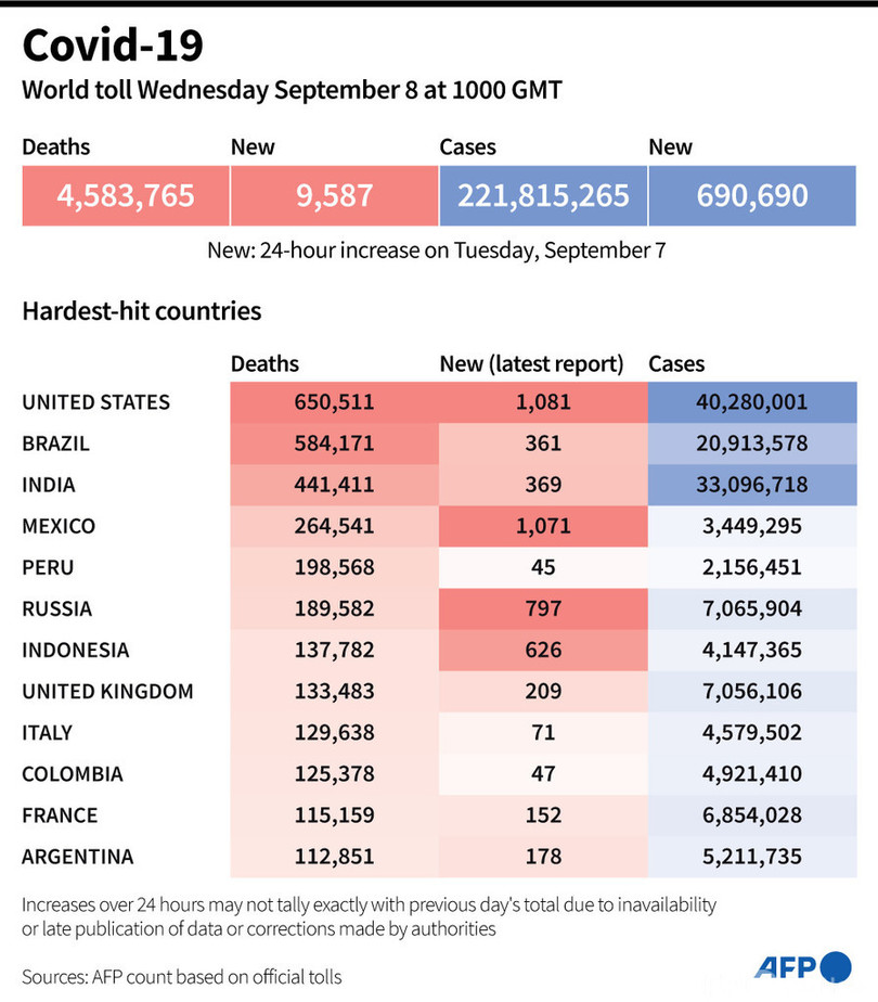 【9月9日 AFP】AFPが各国当局の発表に基づき日本時間8日午後7時にまとめた統計によると、世界の新型コロナウイルスによる死者数は458万3765人に増加した。