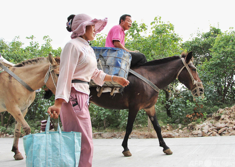 蚰蜒山では、ショベルカーで山腹の途中まで資材を運び、馬やラバが背負ったかごに移し替える。30代の女性、庹麦梅(Tuo Maimei)さんが馬やラバの隊列を誘導し、山頂までの険しい山道を登っている。(c)CNS/JCM/AFPBB News