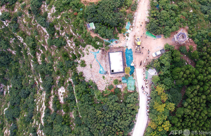 蚰蜒山では、ショベルカーで山腹の途中まで資材を運び、馬やラバが背負ったかごに移し替える。30代の女性、庹麦梅(Tuo Maimei)さんが馬やラバの隊列を誘導し、山頂までの険しい山道を登っている。(c)CNS/JCM/AFPBB News