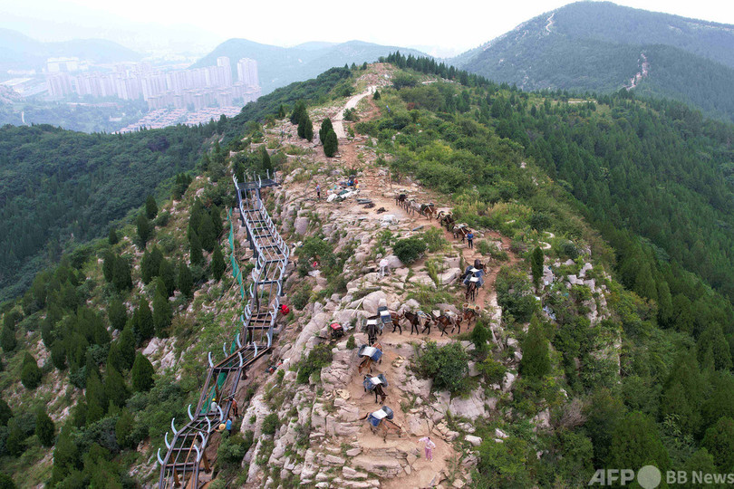蚰蜒山では、ショベルカーで山腹の途中まで資材を運び、馬やラバが背負ったかごに移し替える。30代の女性、庹麦梅(Tuo Maimei)さんが馬やラバの隊列を誘導し、山頂までの険しい山道を登っている。(c)CNS/JCM/AFPBB News