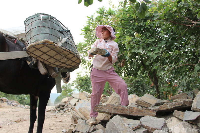 蚰蜒山では、ショベルカーで山腹の途中まで資材を運び、馬やラバが背負ったかごに移し替える。30代の女性、庹麦梅(Tuo Maimei)さんが馬やラバの隊列を誘導し、山頂までの険しい山道を登っている。(c)CNS/JCM/AFPBB News