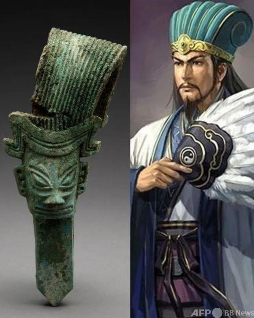 また、同じ3号坑から出土されたもう1体の青銅の人物像は、映画やドラマ、ゲームの中の諸葛亮の姿に似ています。髪の毛をまとめて後方に流して瓦のようなかたちにしている部分は、諸葛亮がかぶっている帽子によく似ています。(c)CGTN Japanese/AFPBB News