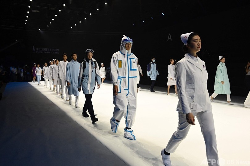 【9月12日 AFP】中国北京で開催された中国ファッションウィーク(China Fashion Week)で、新型コロナウイルスとの闘いを描いた同国の連続テレビドラマ「最美逆行者(Heroes in Harm's Way)」のコレクションが発表された。防護服姿や医師の格好をしたモデルがランウェイに登場し、踊ったりした。