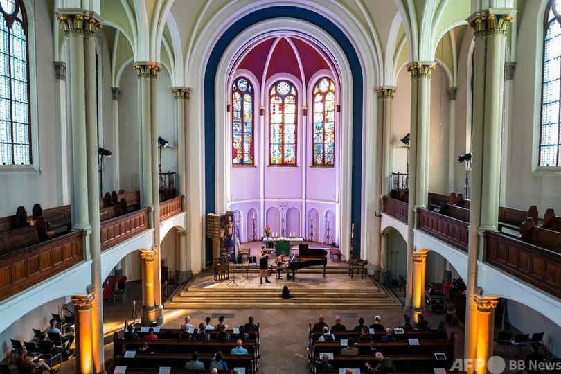 【9月22日 AFP】ドイツ・ベルリンの教会で開かれたリサイタルで、ピアニストとフルート奏者がノルウェーの作曲家グリーグ(Edvard Grieg)の曲を演奏している。