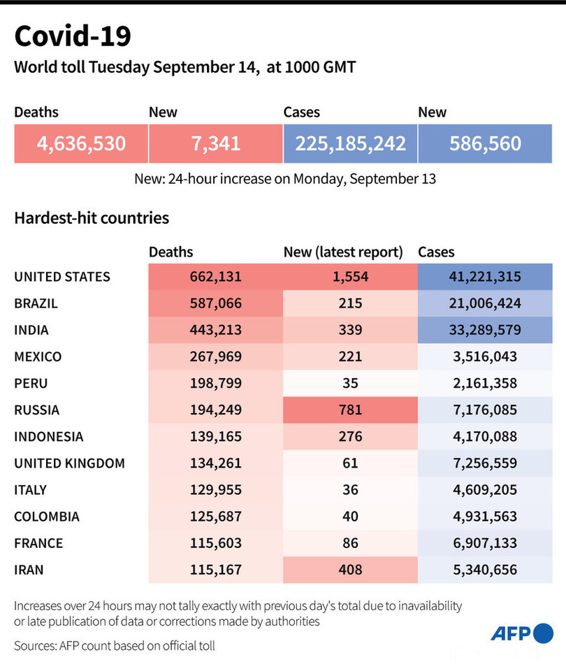 【9月15日 AFP】AFPが各国当局の発表に基づき日本時間14日午後7時にまとめた統計によると、世界の新型コロナウイルスによる死者数は463万6530人に増加した。
