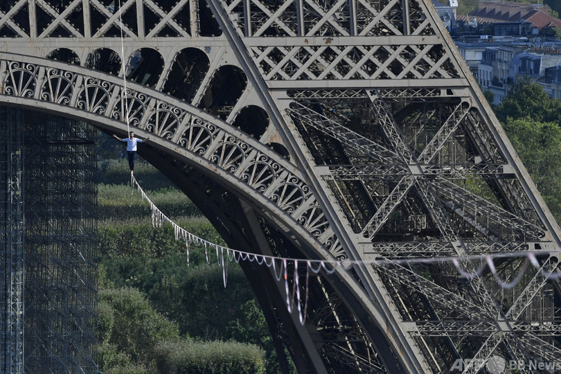 エッフェル塔背にそろりそろり…スラックライン挑戦 仏パリ