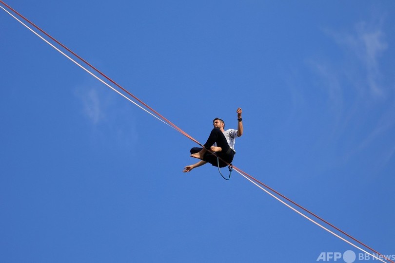 【9月19日 AFP】仏パリで18日、フランス人のナタン・ポラン(Nathan Paulin)さんが、エッフェル塔(Eiffel Tower)と国立シャイヨー劇場(Theatre National de Chaillot)の間に張られた線の上を歩くスラックラインに挑んだ。長さ670メートルで、地上70メートルの高さに設置された。