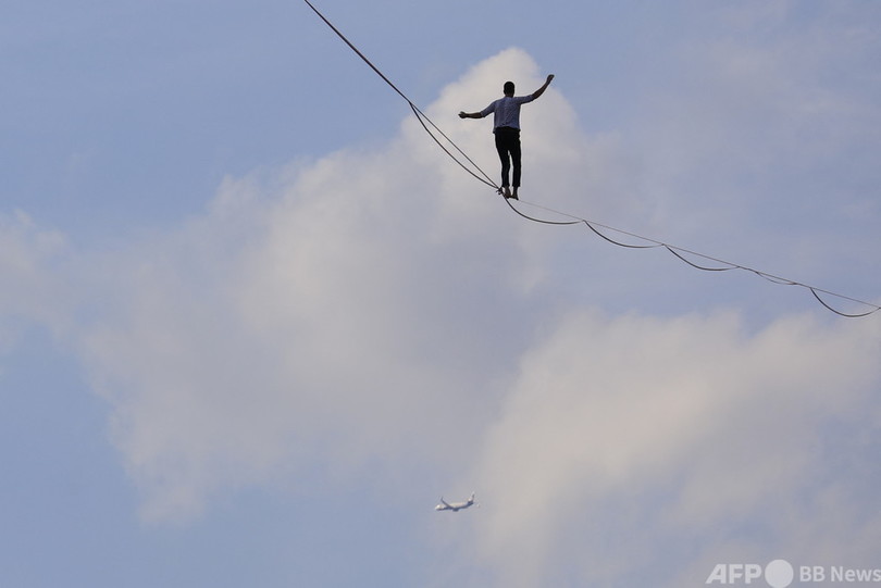 【9月19日 AFP】仏パリで18日、フランス人のナタン・ポラン(Nathan Paulin)さんが、エッフェル塔(Eiffel Tower)と国立シャイヨー劇場(Theatre National de Chaillot)の間に張られた線の上を歩くスラックラインに挑んだ。長さ670メートルで、地上70メートルの高さに設置された。