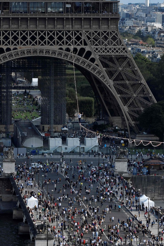 【9月19日 AFP】仏パリで18日、フランス人のナタン・ポラン(Nathan Paulin)さんが、エッフェル塔(Eiffel Tower)と国立シャイヨー劇場(Theatre National de Chaillot)の間に張られた線の上を歩くスラックラインに挑んだ。長さ670メートルで、地上70メートルの高さに設置された。