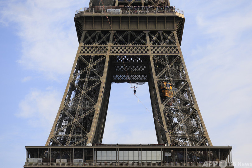 【9月19日 AFP】仏パリで18日、フランス人のナタン・ポラン(Nathan Paulin)さんが、エッフェル塔(Eiffel Tower)と国立シャイヨー劇場(Theatre National de Chaillot)の間に張られた線の上を歩くスラックラインに挑んだ。長さ670メートルで、地上70メートルの高さに設置された。