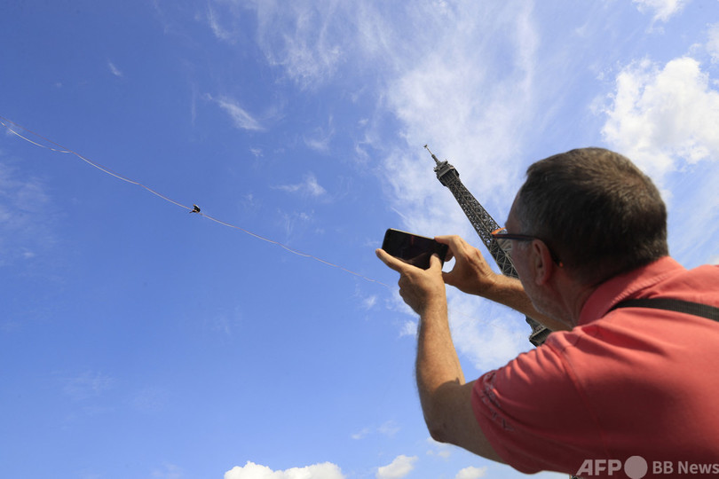 【9月19日 AFP】仏パリで18日、フランス人のナタン・ポラン(Nathan Paulin)さんが、エッフェル塔(Eiffel Tower)と国立シャイヨー劇場(Theatre National de Chaillot)の間に張られた線の上を歩くスラックラインに挑んだ。長さ670メートルで、地上70メートルの高さに設置された。