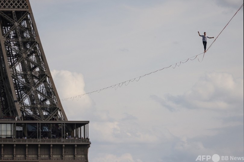 【9月19日 AFP】仏パリで18日、フランス人のナタン・ポラン(Nathan Paulin)さんが、エッフェル塔(Eiffel Tower)と国立シャイヨー劇場(Theatre National de Chaillot)の間に張られた線の上を歩くスラックラインに挑んだ。長さ670メートルで、地上70メートルの高さに設置された。