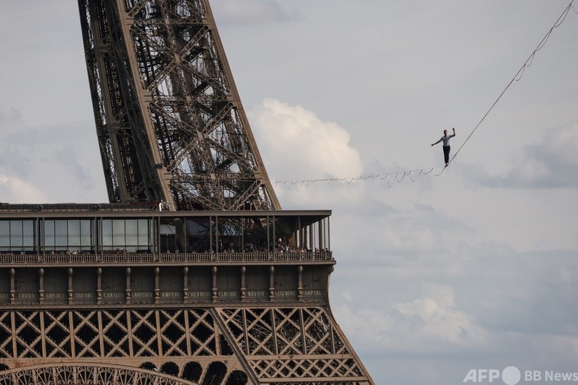 【9月19日 AFP】仏パリで18日、フランス人のナタン・ポラン(Nathan Paulin)さんが、エッフェル塔(Eiffel Tower)と国立シャイヨー劇場(Theatre National de Chaillot)の間に張られた線の上を歩くスラックラインに挑んだ。長さ670メートルで、地上70メートルの高さに設置された。