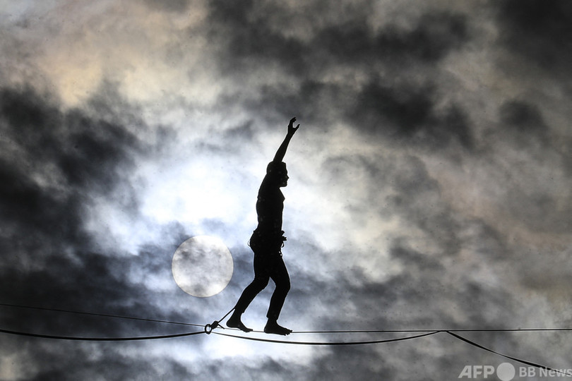【9月19日 AFP】仏パリで18日、フランス人のナタン・ポラン(Nathan Paulin)さんが、エッフェル塔(Eiffel Tower)と国立シャイヨー劇場(Theatre National de Chaillot)の間に張られた線の上を歩くスラックラインに挑んだ。長さ670メートルで、地上70メートルの高さに設置された。