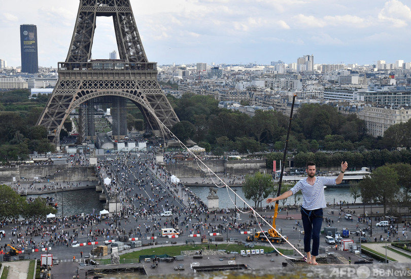 【9月19日 AFP】仏パリで18日、フランス人のナタン・ポラン(Nathan Paulin)さんが、エッフェル塔(Eiffel Tower)と国立シャイヨー劇場(Theatre National de Chaillot)の間に張られた線の上を歩くスラックラインに挑んだ。長さ670メートルで、地上70メートルの高さに設置された。