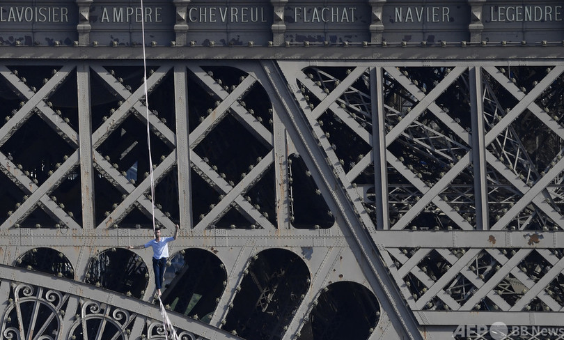 【9月19日 AFP】仏パリで18日、フランス人のナタン・ポラン(Nathan Paulin)さんが、エッフェル塔(Eiffel Tower)と国立シャイヨー劇場(Theatre National de Chaillot)の間に張られた線の上を歩くスラックラインに挑んだ。長さ670メートルで、地上70メートルの高さに設置された。