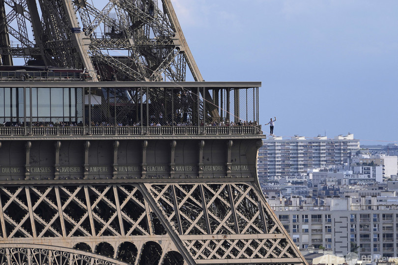【9月19日 AFP】仏パリで18日、フランス人のナタン・ポラン(Nathan Paulin)さんが、エッフェル塔(Eiffel Tower)と国立シャイヨー劇場(Theatre National de Chaillot)の間に張られた線の上を歩くスラックラインに挑んだ。長さ670メートルで、地上70メートルの高さに設置された。