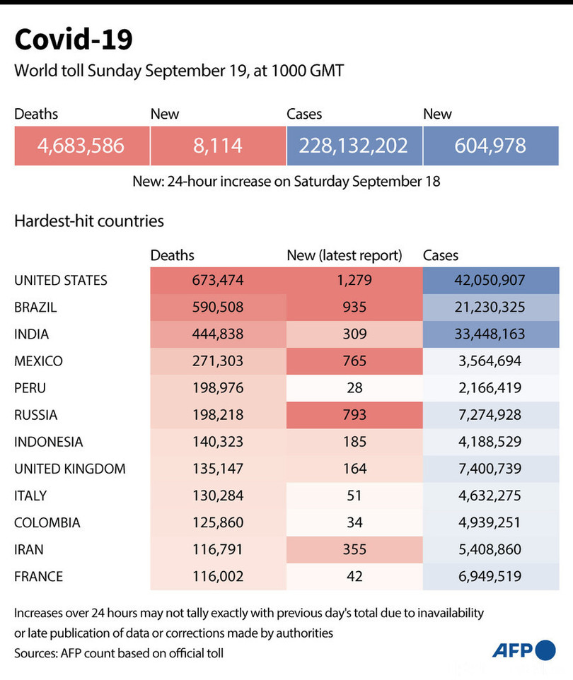 【9月19日 AFP】AFPが各国当局の発表に基づき日本時間19日午後7時にまとめた統計によると、世界の新型コロナウイルスによる死者数は468万3586人に増加した。