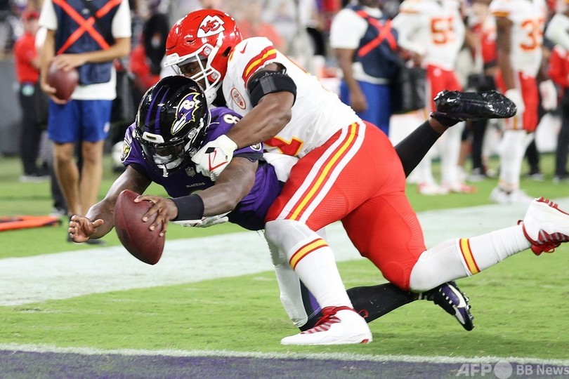 【9月20日 AFP】21NFLは19日、第2週の試合が行われ、ボルティモア・レイヴンズ(Baltimore Ravens)は36-35でカンザスシティ・チーフス(Kansas City Chiefs)に勝利し、ラマー・ジャクソン(Lamar Jackson)とパトリック・マホームズ(Patrick Mahomes)のリーグ最優秀選手(MVP)を獲得したQB同士の対決は、レイヴンズのジャクソンに軍配が上がった。