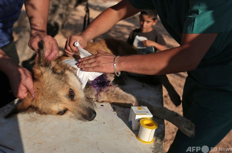 【9月22日 AFP】シリア北西部イドリブ(Idlib)市南郊でこのほど、爆弾の破片でけがをした犬の治療が行われ、脚が切断された。
