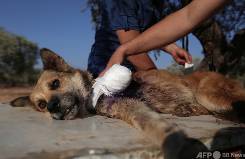 【9月22日 AFP】シリア北西部イドリブ(Idlib)市南郊でこのほど、爆弾の破片でけがをした犬の治療が行われ、脚が切断された。