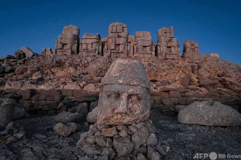 【9月26日 AFP】トルコ南東部アドゥヤマン(Adiyaman)のネムルト山(Mount Nemrut)の遺跡にある、岩でできた巨大な頭像。標高2134メートルのネムルト山は、1987年に国連教育科学文化機関(UNESCO、ユネスコ)の世界遺産(World Heritage)に登録された。1881年にドイツ人技師が、ゼウス(Zeus)やアポロン(Apollo)などギリシャ神話の神々の像に囲まれた王アンティオコス1世(King Antiochus I)を表した高さ10メートルの座像を発見した。(c)AFP