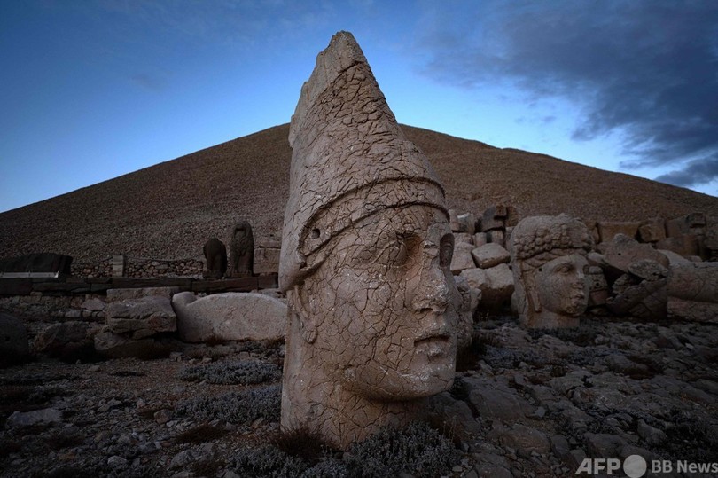 【9月26日 AFP】トルコ南東部アドゥヤマン(Adiyaman)のネムルト山(Mount Nemrut)の遺跡にある、岩でできた巨大な頭像。標高2134メートルのネムルト山は、1987年に国連教育科学文化機関(UNESCO、ユネスコ)の世界遺産(World Heritage)に登録された。1881年にドイツ人技師が、ゼウス(Zeus)やアポロン(Apollo)などギリシャ神話の神々の像に囲まれた王アンティオコス1世(King Antiochus I)を表した高さ10メートルの座像を発見した。(c)AFP