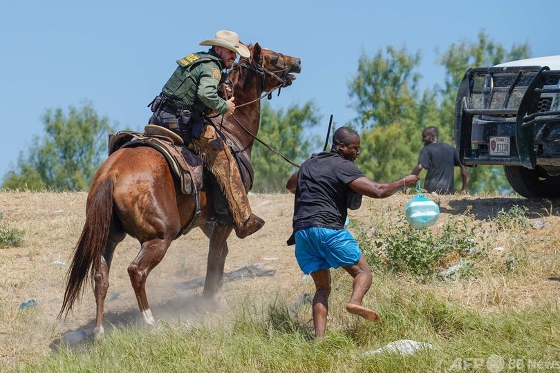 AFPのポール・レイチ(Paul Ratje)カメラマンが19日、テキサス州デルリオ(Del Rio)で撮影した一連の写真には、国境警備隊が馬の長い手綱を振って不法移民を威嚇し、国境を流れるリオグランデ(Rio Grande)川に押し戻しているように見える場面が写っている。